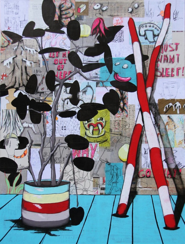 Und das wird in jedem Fall bunt und inspirierend, denn nebenbei stellt Tilo Kaiser weitere seiner Werke vor: Bilder, die aus einzelnen zeichnerischen Elementen zusammengefügt sind, die jeweils ihre ganz eigene Geschichte erzählen und zu einem expressionistischen Ganzen zusammengefügt sind. „Das Auge des Betrachters muß wandern koennen“, sagt Tilo Kaiser. „Denn inhaltlich geht es mir in meiner Arbeit um alles, was das tägliche Leben so an uns herantragen kann und darf. Dabei beziehe ich mich teils ironisch, teils spielerisch auf den „Dschungel“, in dem wir leben, sei er urban oder pflanzlich. Formen aus der Architektur werden mit Formen aus der Botanik kontrastiert, menschliche Elemente rangeln mit pflanzlichen um Dominanz auf der Bildflaeche. Schaut man sich in dem Chaos um, in welchem wir momentan leben, ist nicht klar, welcher Dschungel uns als nächstes dominieren wird.“