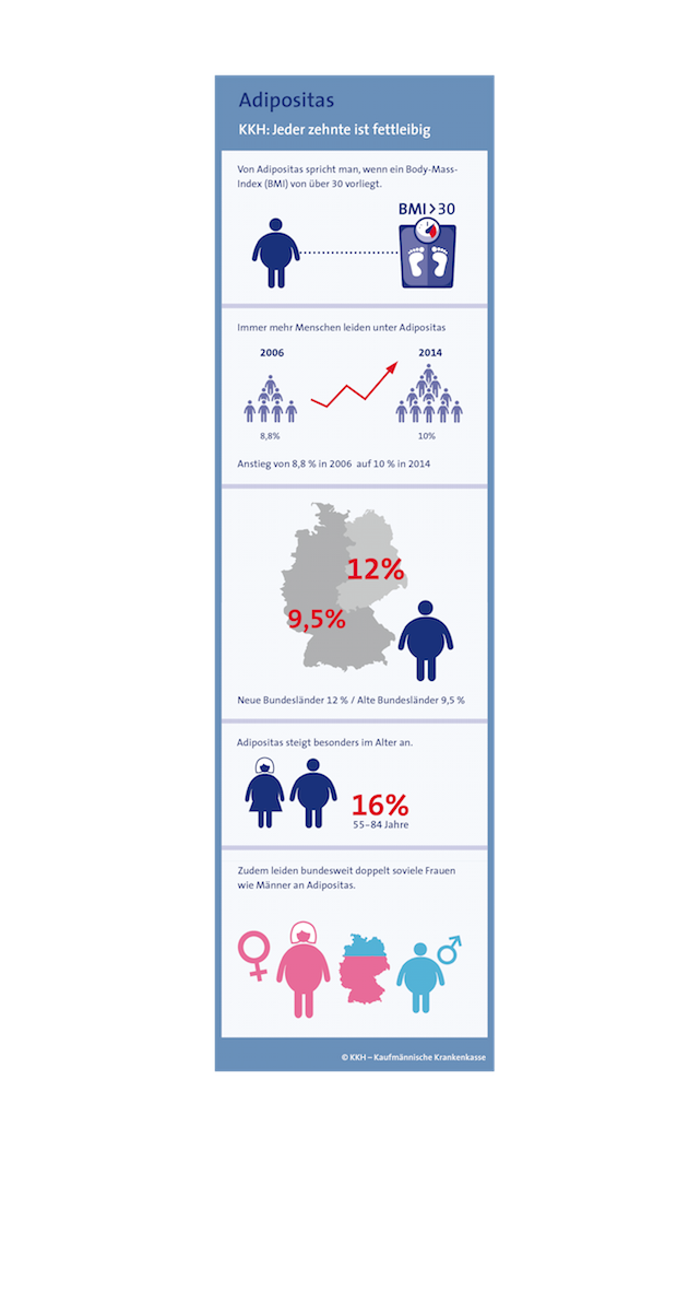 Adipositas ist eine Erkrankung mit vielen unterschiedlichen Ursachen. Genetische, biologische, neurologische, psychologische und soziale Faktoren können die Entstehung einer Adipositas begünstigen. Bei einem steigenden Body-Mass-Index wächst das Risiko für Begleit- und Folgeerkrankungen. Dazu gehört unter anderem der Diabetes mellitus Typ 2. Bereits jeder dritte daran erkrankte KKH-Versicherte ist gleichzeitig auch adipös.