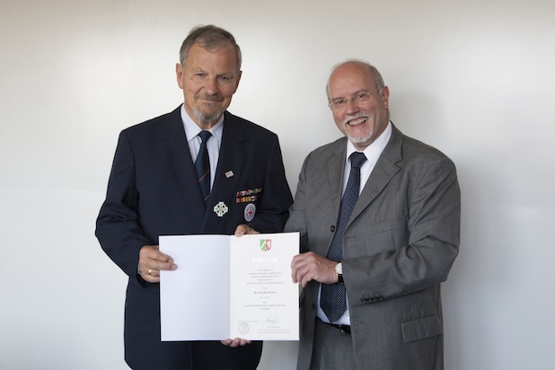 Arnsberg – In Würdigung seiner besonderen Verdienste um den Katastrophenund Zivilschutz sowie das Rettungswesen hat Minister Ralf Jäger dem Netphener Berthold Siebel das Katastrophenschutz-Ehrenzeichen in Silber verliehen. Die seltene Auszeichnung übergab der u.a. für das Rettungswesen verantwortliche Abteilungsleiter bei der Bezirksregierung Arnsberg, Michael Kirchner, an den langjährigen, ehrenamtlichen Rot-Kreuz-Mitarbeiter am 24. Juli in Arnsberg.