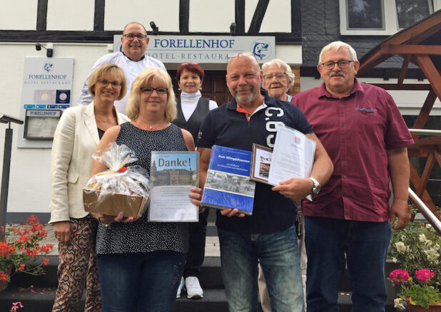 Die BLB Tourismus GmbH, die Stadt Bad Berleburg und Ortsvorsteher Karl Heinrich Sonneborn bedankten sich für die Treue mit einem Präsentkorb, einer Urkunde und einem Bildband über Aue-Wingeshausen. Während der Ehrung der Gäste erzählte das Ehepaar Brühn von vielen Erlebnissen. So haben die Eltern von Silvia Brühn mit einem großen Freundeskreis aus Berlin über Jahre hinweg Allerheiligen in Wingeshausen verbracht, bis zuletzt das ganze Haus belegt war. „Hier ist einfach Ruhe“, erzählt Silvia Brühn begeistert, „hier kann man die Seele baumeln lassen und wir genießen die Tage in der Natur.“