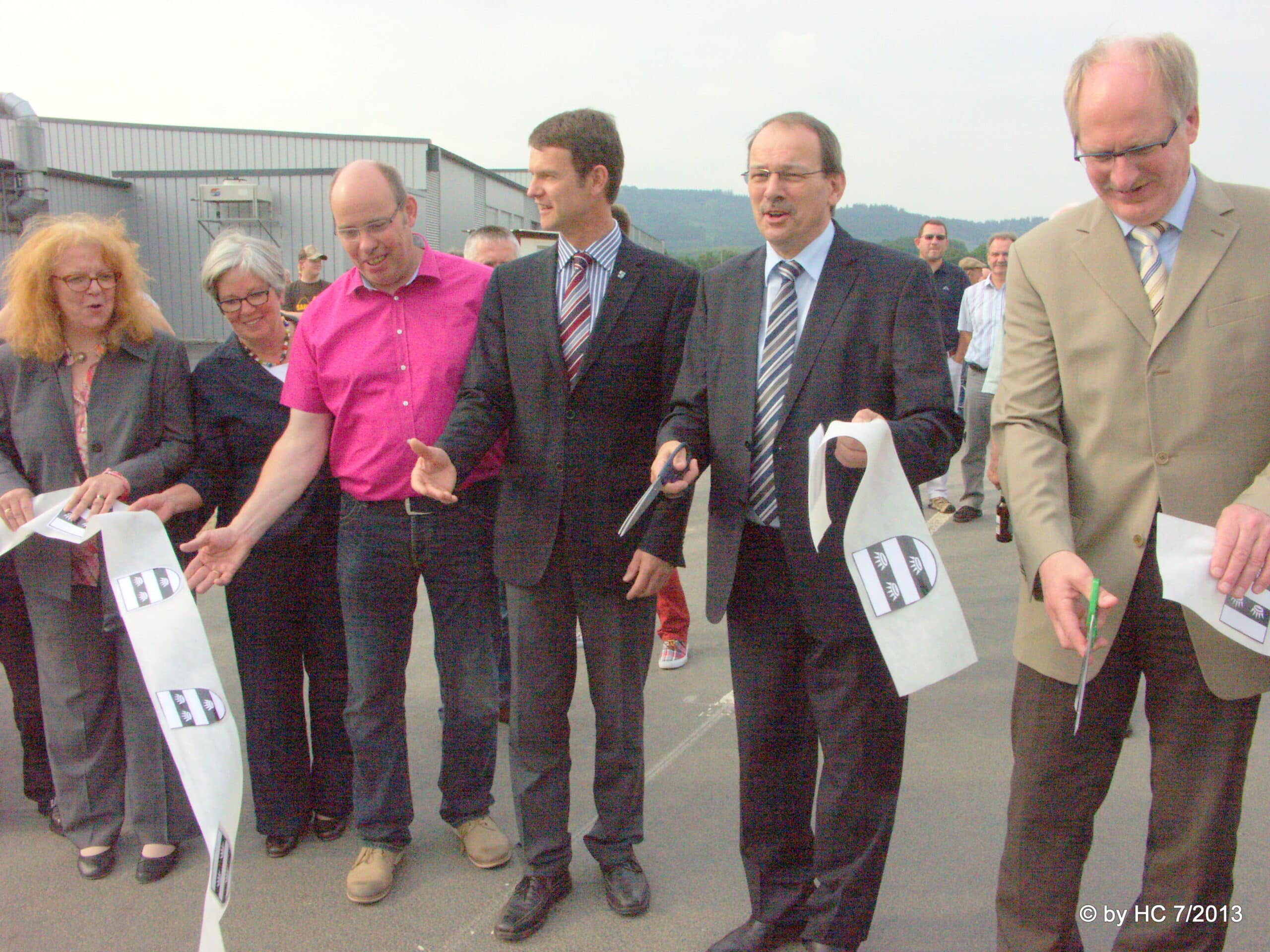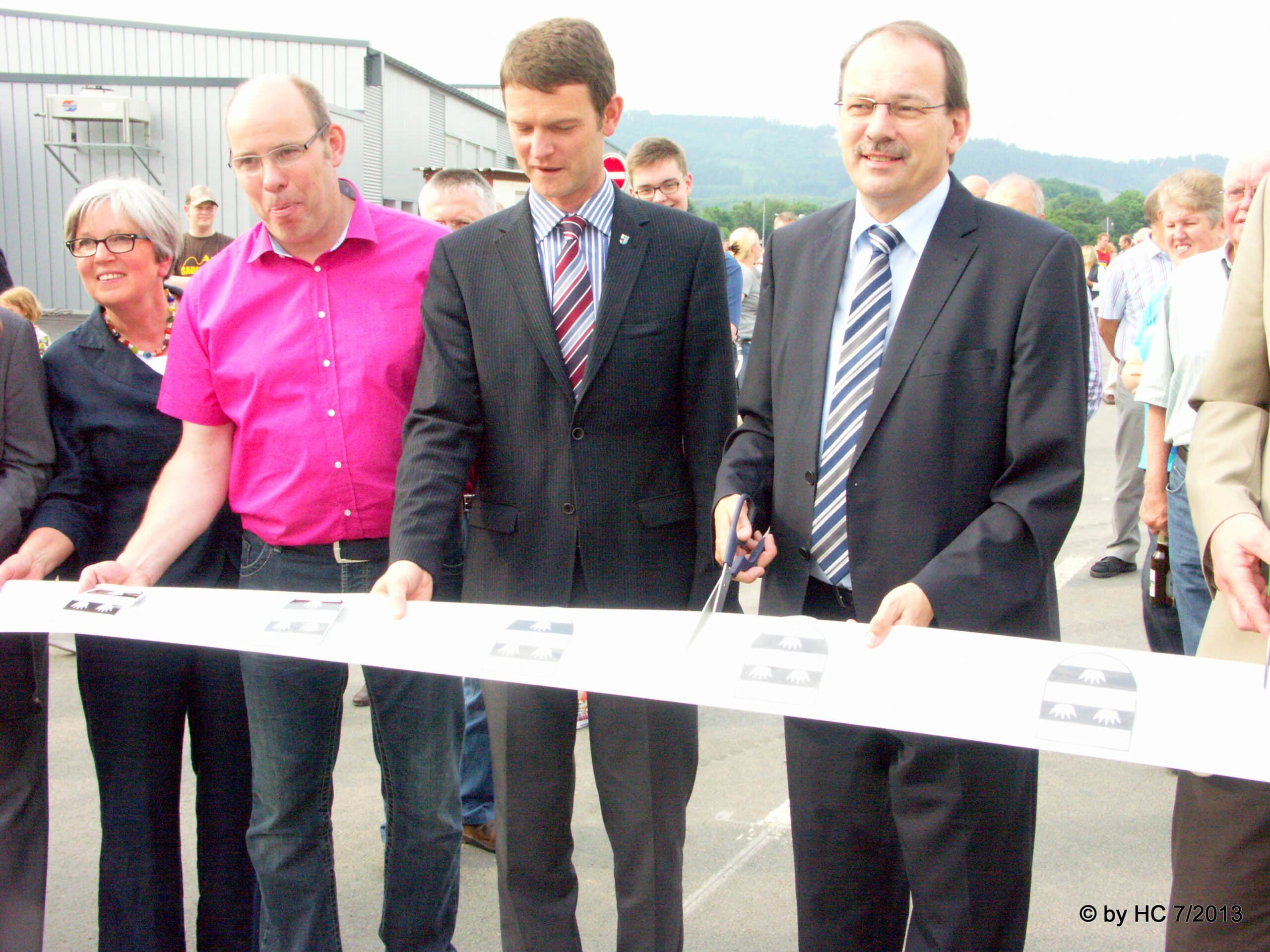 Landrat Thomas Gemke zerschnitt gemeinsam mit dem Ortsvorsteher Christoph Haarmann(Garbeck), Bürgermeister Hubertus Mühling(Balve) und Michael Neumann von StraßenNRW das mit dem Garbecker Wappen verzierte Absperrband an der neuen Straße in Höhe der Firma Rickmeier.