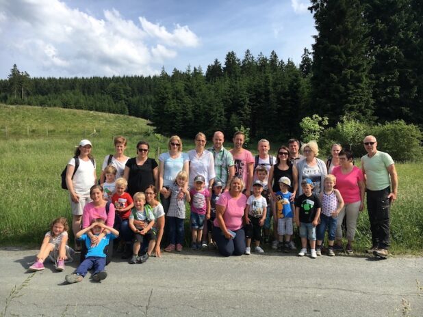 Die gelbe Gruppe des DRK Familienzentrums Winterberg machte zu ihrem Gruppenfest eine „Wichtelwanderung“ in den Buchenwald am Minenplatz mit dem Waldpädagogen und Forstwirten Christoph und Berni Leber. Die Kinder und ihre Eltern wurden in zwei Gruppen aufgeteilt. Daraufhin ging es zu interessanten und lehrreichen Spielen in den Wald. Gemeinsam mit Mama oder Papa wurden unter anderem an Bäumen aus vorhandenem Material des Waldes Waldgeister gestaltet, eine Bobbahn in den Waldboden gebaut und an einem eigens gewählten Lieblingsbaum 15 Minuten entspannt und den Geräuschen im Wald gelauscht. Auch ein Waldgang mit verbundenen Augen und „blindem“ Vertrauen auf den Vordermann gehörten dazu. Zum Abschluss gab es ein gemeinsames Picknick auf einer herrlichen Waldwiese. Abschließend bleibt ein ereignisreicher und naturnaher Tag!