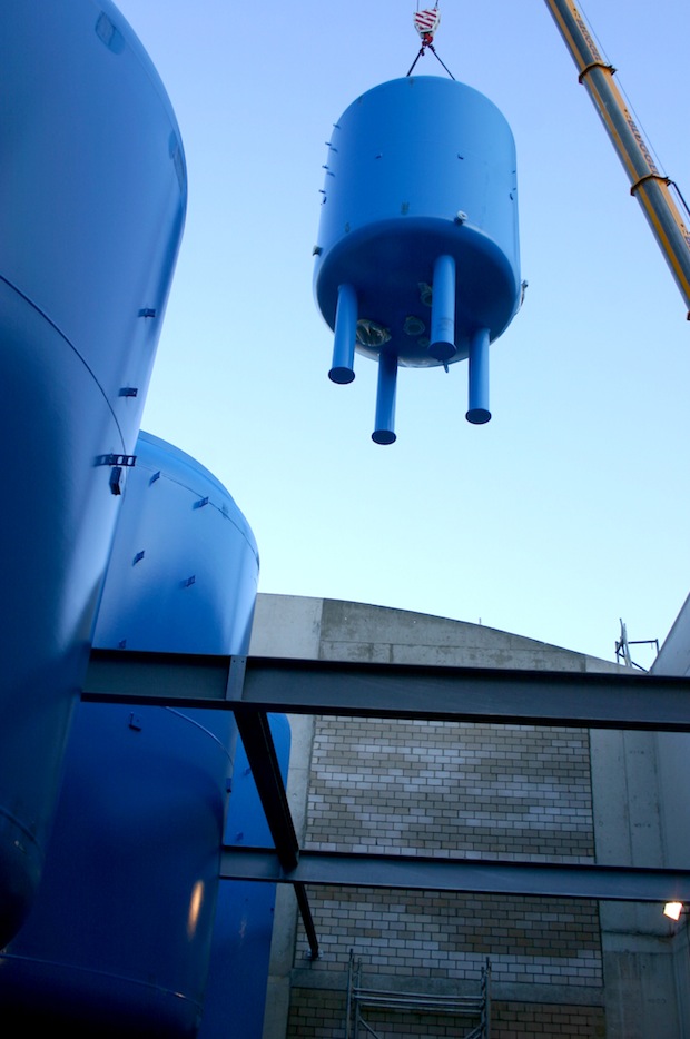 Meschede – Das war Maßarbeit: Fünf riesige Filterkessel wurden am Dienstag, 25. November, nacheinander in das künftige Wasserwerk Hennesee gehievt. Jeder der drei Mehrschichtfilter bringt lockere 12,6 Tonnen auf die Waage. Und die beiden Aktivkohlefilter wiegen sogar je 13,8 Tonnen. Auf Tiefladern wurden die gewichtigen Bauteile per Schwertransport nach Meschede gebracht. Ein Spezialkran platzierte sie anschließend millimetergenau im neuen Wasserwerk. Zwei kleinere Druckwindkessel und einen Reaktionsbehälter ebenso.