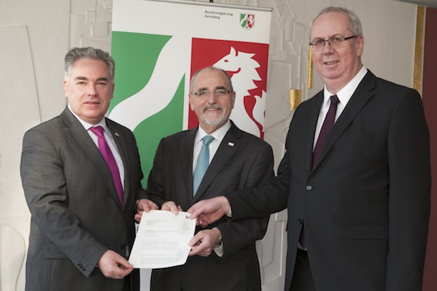 Olsberg/Bestwig – Nicht nur ein Fall, sondern sogar ein Bewilligungsbescheid für zwei: Regierungspräsident Dr. Gerd Bollermann überreichte jetzt in Arnsberg den Bürgermeistern Wolfgang Fischer (Olsberg) und Ralf Péus (Bestwig) die Genehmigung, um einen Teilstandort der Sekundarschule Olsberg am Bestwiger Franz-Hoffmeister-Schulzentrum zu errichten. Wichtig: In Kraft tritt die Bewilligung nur, wenn in der Zeit vom 8. bis 14. Februar mindestens 50 Kinder für den geplanten Teilstandort angemeldet werden.