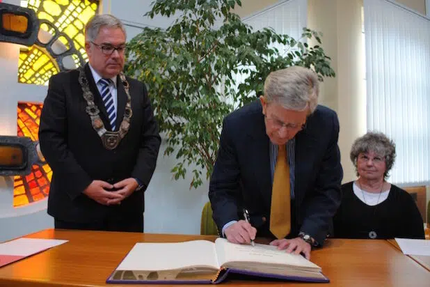 Seine Geschichte erzählte den Menschen im Olsberger Ratssaal auch Fred Stern – wie er den Ort, der für seine Familie und Vorfahren über hunderte von Jahren Zuhause war, verlassen musste, und vom schwierigen Neuanfang in den Vereinigten Staaten, wo er als Kind Zeitungen verkaufte, um zum Familienunterhalt beizutragen. Von der Ausstellung und dem herzlichen Empfang zeigte der 87-Jährige sich beeindruckt: „So etwas habe ich nicht erwartet.“ Bürgermeister Wolfgang Fischer lud den Gast ein, sich ins Goldene Buch der Stadt Olsberg einzutragen: „Weil das Leben unserer damaligen jüdischen Mitbürger ein untrennbarer Bestandteil der Olsberger Stadtgeschichte ist, haben wir – die heutige und die nachfolgende Generation – die Verpflichtung und die Aufgabe, die Erinnerung lebendig zu halten.“ Dazu mahnte auch Uta Weigand für den Arbeitskreis „Stolpersteine“ – man sehe die „Verantwortung, dass hinter jedem Namen ein Gesicht und hinter jedem Gesicht eine Geschichte steht.“