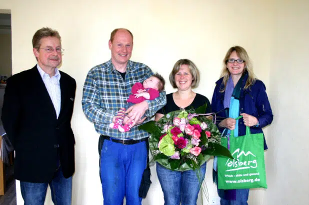 Olsberg – Ein paar Wochen erst ist sie alt – und schon ganz souverän beim Fototermin. Franziska Bathen verschlief zwar die Begrüßung, doch als sie samt Eltern fotografiert werden sollte, war die kleine Olsbergerin wach. Ihre Eltern bekamen das 400. Babybegrüßungspaket der Stadt Olsberg – und darum besonderen Besuch. Nicht nur – wie sonst bei jedem Neugeborenen – Familienmanagerin Jutta Maas stand vor der Tür, sondern auch Norbert Märtin, Fachbereichsleiter Ordnung, Umwelt und Soziales. Und neben dem obligatorischen Begrüßungspaket, das pickepacke voll mit Informationen für die junge Familie ist, überreichte er den Jubiläumseltern einen Blumenstrauß.