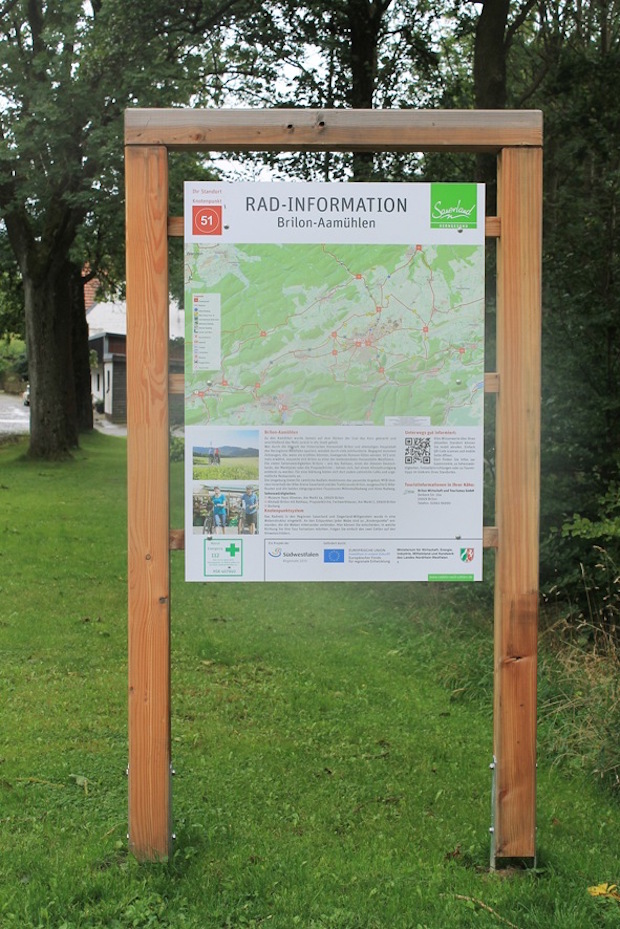 Die Beschilderung im Hochsauerlandkreis ist als erster Kreis in Südwestfalen nun fertiggestellt. Das Radnetz wurde in eine Wabenstruktur eingeteilt. An den Eckpunkten jeder Wabe ergeben sich ‚Knotenpunkte‘, von denen aus ist die Weiterfahrt in mehrere Richtungen möglich. Die Knotenpunkte sind durchnummeriert, danach können sich Radfahrer gut orientieren. Der Radler merkt sich die Nummer oder schreibt sich vorab eine Zahlenfolge auf – und folgt dann der entsprechenden Beschilderung. Die Radtour lässt sich nach diesem System flexibler gestalten – je nachdem, wie viel Puste, Zeit oder Lust dem Radler noch bleibt. Ergänzend zeigen Informationstafeln den aktuellen Standort am Knotenpunkt mit Ortsnamen, Kartenausschnitt, einem Infotext und dem QR-Code sowie der nächstgelegenen Tourist-Information.