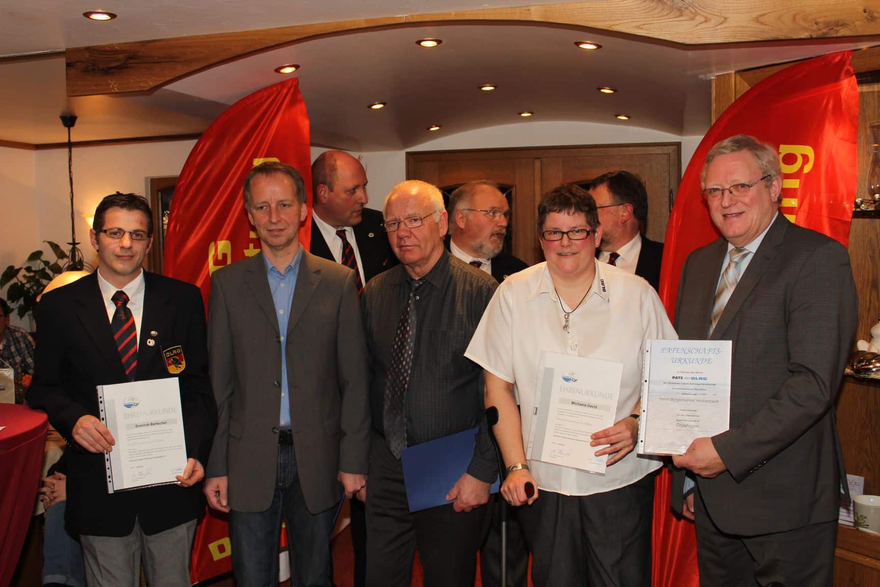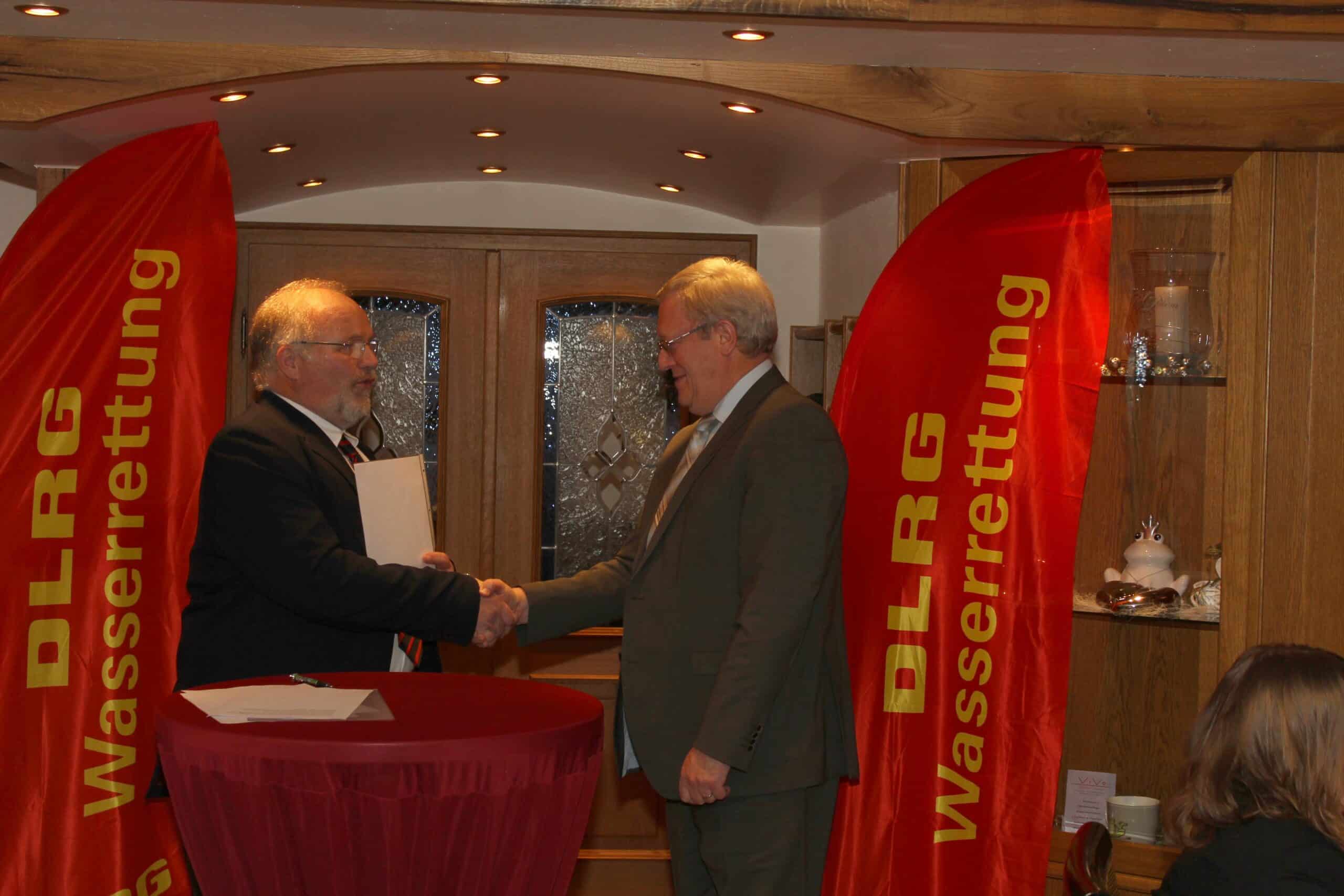 Am 23.02.2013 hatte der 1. Vorsitzende Wolfgang Gräve der DLRG Ortsgruppe Drolshagen e.V. zu einem Ehrungsabend ins Hotel zur Brücke eingeladen. Ca. 30 Mitglieder der OG, der Bürgermeister Herr Theo Hilchenbach, Jens Gipperich von der Feuerwehr, Gertrud Schneider vom DRK und Herr Lienenkämper von der CDU waren seiner Einladung gefolgt. Vom DLRG Bezirk Süd Sauerland war der Bezirksleiter Peter Lubig und vom Landesverband Westfalen der Vizepräsident Carsten Hafermas anwesend. Nach einigen Worten zur Begrüßung wurden von Wolfgang Gräve mehrere Aktionen der DLRG zum Jubiläumsjahr (die DLRG feiert dieses Jahr 100 jähriges Bestehen, dieses wird z.B. von den Landesverbänden Westfalen und Nordrhein u.a. mit einem Familienfest, Blaulichtmeile, Bootsstaffel u.v.m. gefeiert) bekanntgegeben. Die DLRG Drolshagen wurde am 12.12.1975 gegründet und ihre Entwicklung wurde ebenfalls kurz vorgestellt. Als nächstes wurde die Aktion „werde Pate der DLRG“ vorgestellt und es konnte unser Bürgermeister Herr Theo Hilchenbach als erster Pate der DLRG Drolshagen, und auch erster Pate im gesamten Kreis Olpe der DLRG, gewonnen und mit einer Patenschaftsurkunde willkommen geheißen werden. Anschließend übernahm der Bezirksleiter Peter Lubig die Ehrungen des Verdienstabzeichen Silber. Das Verdienstabzeichen in Silber wird für mindestens 12 Jahre aktive, vorbildliche Mitarbeit vom Präsidenten der DLRG und der Landesverbandpräsidentin Westfalen verliehen. Geehrt wurden Michaela David (schon fast 30 Jahre Mitglied, seit 20 Jahren Geschäftsführerin und für Pressearbeit zuständig, ebenso lange als Trainerin am Beckenrand tätig) und Dominik Bartscher (seit fast 10 Jahren Ausbilder für Erste Hilfe und Realistische Unfall und Notfalldarstellung, ausgebildeter Strömungsretter und beim Katastrophenschutz), leider verhindert war Rainer Clemens (über 20 Jahre als Trainer aktiv, 10 Jahre zweiter Vorsitzender). Danach ging das Wort an den Vizepräsidenten des Landesverbandes Westfalen, Carsten Hafermas, der die Ehre hatte, zum ersten Mal in der Dräulzer DLRG- Geschichte, zweimal das Verdienstabzeichen in Gold (für mind. 20 Jahre aktive vorbildliche Mitarbeit) zu verleihen. Gold erhielten Rudi Kleta (Gründungsmitglied, u.a. seit 37 Jahren über 500 Kindern das Schwimmen in ca. 2400 Stunden beigebracht, einige Jahre als Kassenwart tätig) und Christoph Lütticke (seit 35 Jahren Mitglied, erst hat er Rettungsschwimmer ausgebildet, danach vielen hundert Kindern das Schwimmen beigebracht).