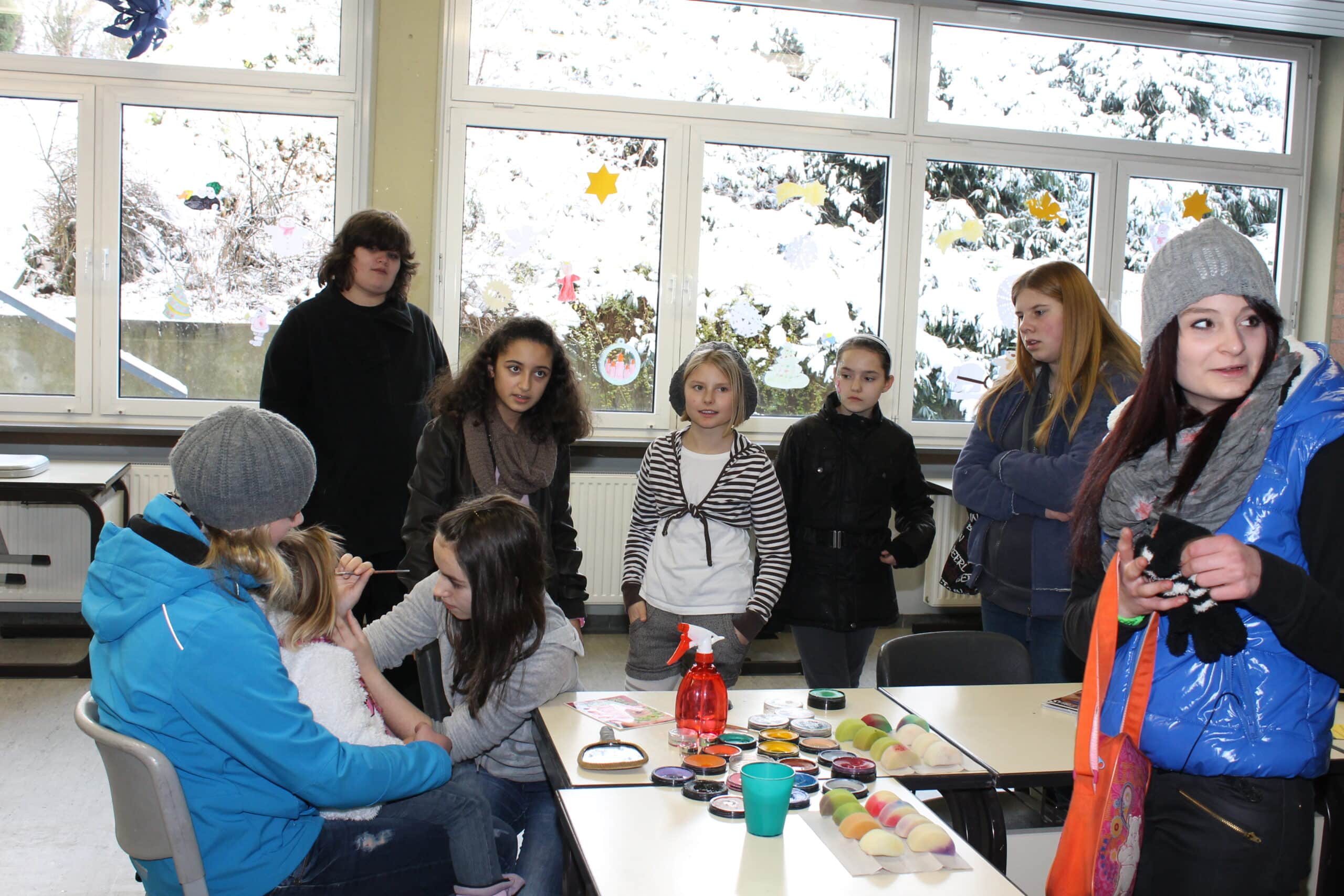 Ein tolles, sehr informatives aber auch kreatives Programm hatten die verantwortlichen Schüler, Lehrer und Eltern auf die Beine gestellt. Nach einer kurzen Begrüßung in der Aula startete die Infoveranstaltung für die derzeitigen Viertklässler. Im Anschluss konnte man sich in der Schule umsehen. Viele kreative Angebote wie Laubsägen oder Drahtarbeiten wurden gezeigt, an denen dann auch jeder selbst Hand anlegen konnte. Neben einer großen Verlosung konnten sich die Kinder von Andrea Schreiber und der Agentur Fun Face professionell schminken lassen. In der Cafeteria blieben keine Wünsche offen. Ob Crèpes, Waffeln oder Kuchen und Kaffee, ein großes Angebot an Leckereien stand hier zur Verfügung.