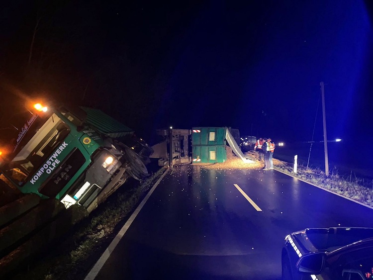 Auf der K18 auf Höhe Arnoldihof in Kirchhundem geriet gegen 5.38 Uhr ein Lkw eines Kompostwerkes aufgrund der Glätte ins Rutschen, wobei sein Anhänger kippte. Da dieser mit „Hackschnitzeln“ beladen war, bedeckten diese komplett die Fahrbahn. Die Straße war über mehrere Stunden gesperrt. Gegen 7.30 Uhr ereignete sich auf der L 714 in Girkhausen ein Alleinunfall, bei dem sich ein 19-jähriger Pkw-Fahrer überschlug. Er wurde leicht verletzt mit einem Rettungswagen in ein Krankenhaus gebracht. Die Feuerwehr war ebenfalls im Einsatz, um auslaufende Betriebsstoffe zu beseitigen.