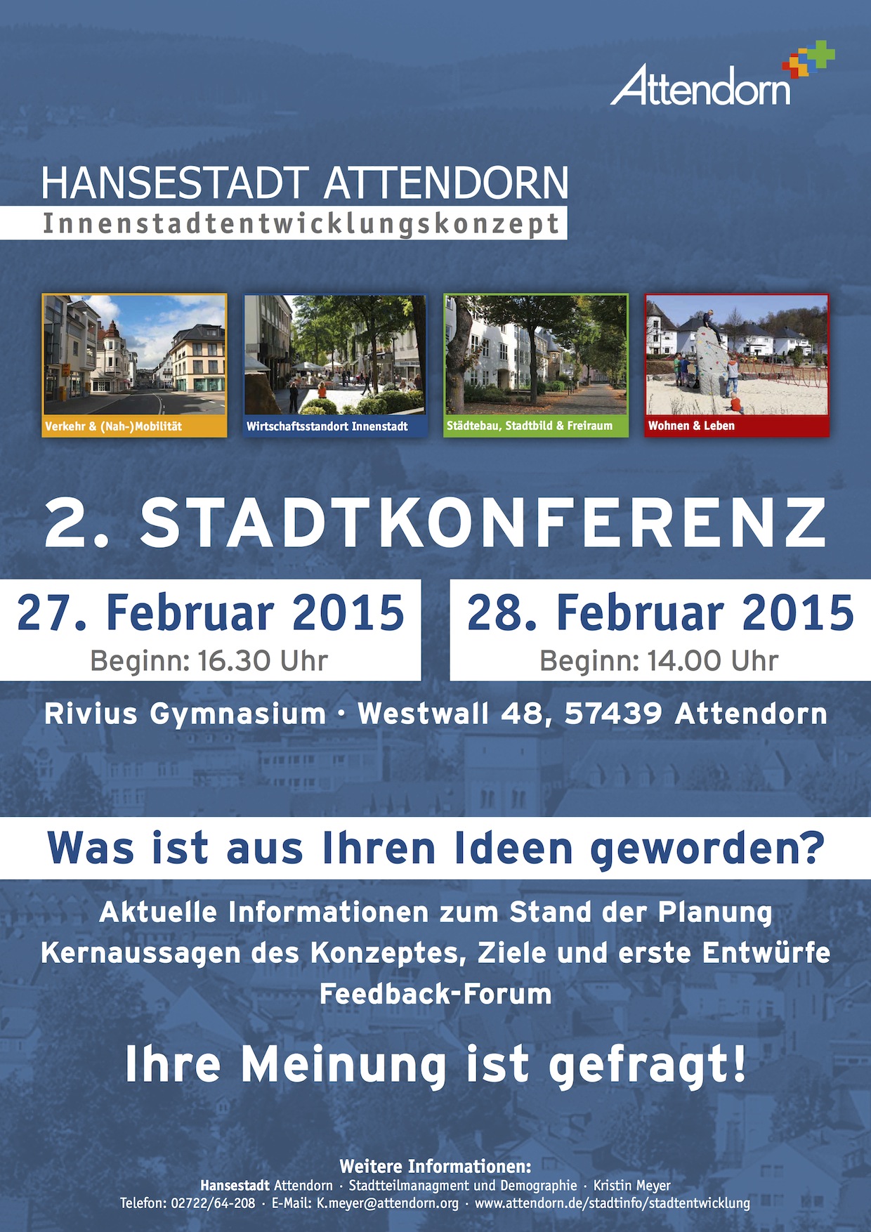 Attendorn – Das Attendorner Innenstadtentwicklungskonzept geht in die nächste Runde: Die Hansestadt Attendorn lädt zur zweiten „Stadtkonferenz“ mit „Feedback-Forum“ am Freitag, 27. Februar 2015, 16.30 Uhr, und am Samstag, 28. Februar 2015, 14.00 Uhr, in das Rivius-Gymnasium Attendorn, ein. Alle Bürgerinnen und Bürger sind herzlich willkommen. Es wird um vorherige Anmeldung gebeten.
