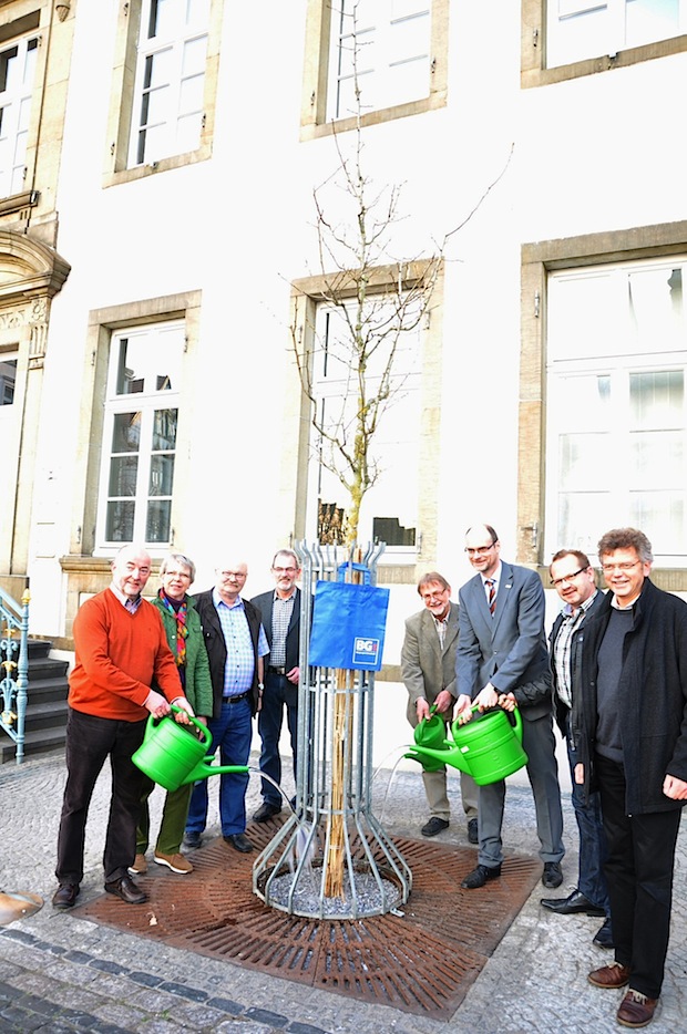 Die Mitglieder der BG Lippstadt haben nun die beiden Bäume offiziell an Bürgermeister Sommer übergeben und symbolisch „angegossen“. Dabei gab der Ortsvereinsvorsitzende der Bürgergemeinschaft, Theodor Kremer, das Versprechen ab: „Wir kommen hier fast jede Woche zusammen und werden ein Auge auf die Bäume haben. Natürlich werden wir bei Bedarf das Gießen übernehmen und auch notwendige Pflegemaßnahmen finanzieren.“