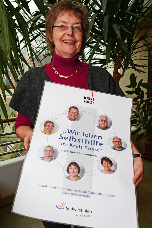 „Ziel der Aktion ist es, der Selbsthilfe ein Gesicht zu geben und so Mitmenschen zu zeigen, dass sich in Selbsthilfegruppen Menschen wie du und ich treffen. Ob nun jemand an Diabetes oder Depression erkrankt ist, es ist wichtig, dass die Betroffen darüber reden und offen mit ihrer Krankheit, oder der eines Angehörigen, umgehen“, erklärt Barbara Burges von der Kontakt- und Informationsstelle für Selbsthilfegruppen (KISS) des Kreises Soest. Sie leitet den Arbeitskreis Selbsthilfe und unterstützt die Gruppenleiterinnen und Gruppenleiter. Von „Wie gründe ich in meiner Gemeinde eine Selbsthilfegruppe zum Thema xy?“ bis hin zu Aktionen und Kommunikationstipps zur Leitung einer Gruppe ist alles dabei. Im Abstand von acht Wochen trifft sich der Arbeitskreis und spricht über aktuelle Themen, Probleme und Pläne. „Die Gruppe stärkt sich gegenseitig. Unter anderem dadurch, dass die Mitglieder erleben können, wie andere Selbsthilfegruppen arbeiten und sich Tipps holen“, so die KISS-Leiterin.