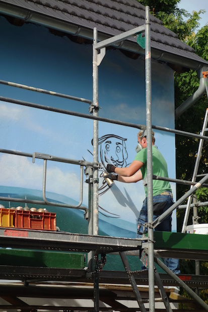 Nach dem Entwurf im März, der sehr gerne von der WMS freigegeben wurde, wartete man gespannt auf die Umsetzung – und am vergangenen Montag war es endlich so weit: Das Kunstwerk am Eigentum der Familie Kaudasch konnte begonnen und abgeschlossen werden. „Der einzige Sonnentag dieser Woche, als würde sich auch der Wettergott auf das Bild freuen“ so die Eigentümerin.