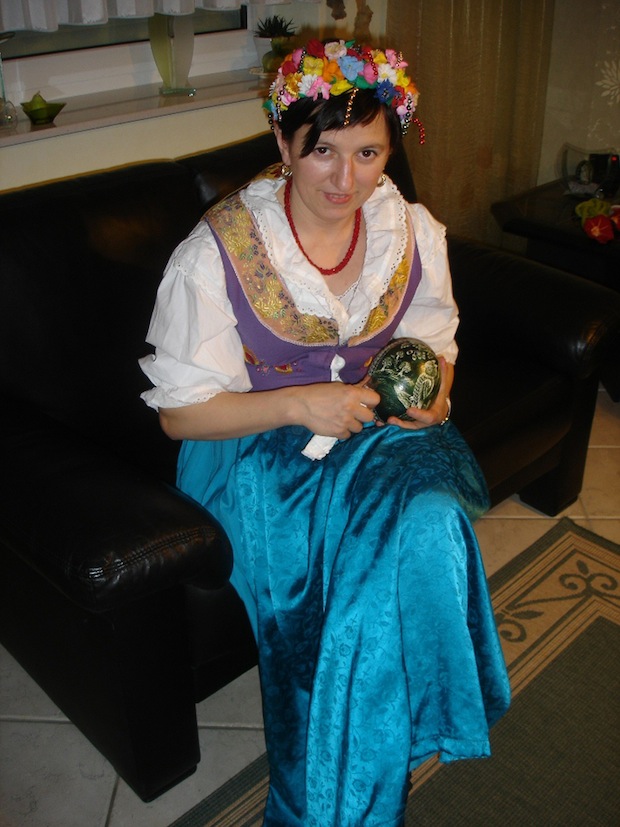 Die Schlesierin verwendet zum Gestalten der Eier eine aufwändige Kratztechnik, bei der mit einem scharfen Gegenstand ein Muster in ein gefärbtes Ei geritzt wird. Als Muster verwendet sie hauptsächlich traditionelle Blumenmotive.