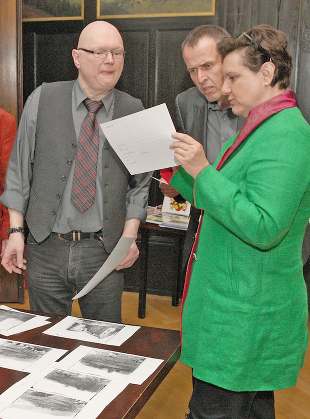 Schauten sich alte Fotos der noch nicht wieder aufgebauten Burg Altena an: (von links) Diplom-Archivar Ulrich Biroth, Fachdienstleiter Detlef Krüger und Kreisdirektorin Barbara Dienstel-Kümper (Foto: Hendrik Klein/Märkischer Kreis).