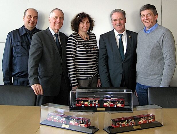 Lüdenscheid (PSL) – Eine bleibende Erinnerung und ein Dankeschön für alle Mühen und Bemühungen soll er sein – der Siku-Modell-Gelenkbus der Feuerwehr Lüdenscheid. Jürgen Flemming, stellvertretender Wehrleiter, und Wehrleiter Martin Walter übergaben jetzt die letzten drei Exemplare der Busse im Maßstab 1:50 an Bürgermeister Dieter Dzewas, Wolff-Dieter Theissen, Fachbereichsleiter Bürgerservice/Soziale Leistungen, und Martina von Schaewen, Fachdienstleitung Öffentliche Sicherheit und Ordnung.