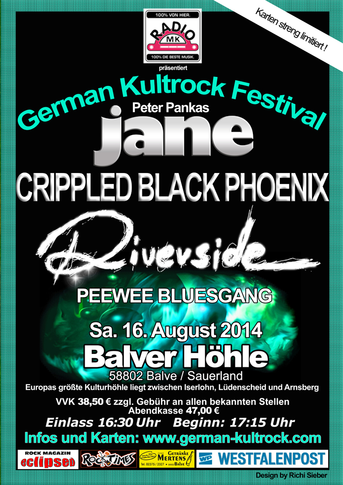 Die Newcomer und Überflieger des Prog-Rocks der letzten Jahre, „CRIPPLED BLACK PHOENIX“ und „RIVERSIDE“, werden neben dem Opener „PEE WEE BLUESGANG“ das Festival gemeinsam bestreiten. Der Vorverkauf läuft bereits auf Hochtouren und sicherlich wird dieses Rockevent wie in den Vorjahren zeitig ausverkauft sein.