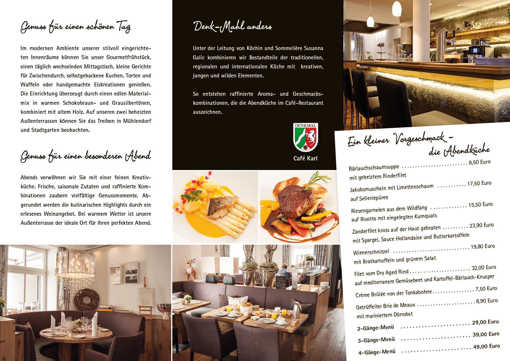 Dabei lassen einem „Jacobsmuscheln mit Limettenschaum auf Selleriepüree“ oder „Filet vom Dry Aged Rind auf mediterranem Gemüsebeet und Kartoffel-Bärlauch-Knusper“ bereits beim Lesen das Wasser im Munde zusammenlaufen. Die Gerichte sind frisch und leicht, traditionell oder innovativ. Je nach Jahreszeit wechselt das Angebot der Abendkarte.
