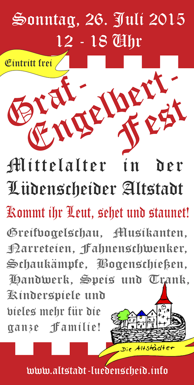 Am Sonntag, 26. Juli 2015, startet das schon zur Tradition gewordene Mittelalterfest des Altstadt-Lüdenscheid e.V. erstmals unter dem Namen „Graf-Engelbert-Fest“. Das beliebte Familienfest findet von 12 bis 18 Uhr auf und um den Graf-Engelbert-Platz in der Lüdenscheider Altstadt statt.