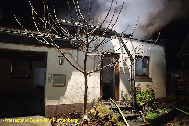 Plettenberg (ots) – Gegen 01:45 Uhr wurden am frühen Morgen die Kräfte der Feuerwehr Plettenberg von der Feuerwehrleitstelle in Lüdenscheid zu einem Dachstuhlbrand in den Ortsteil Köbbinghausen alarmiert. Bereits auf der Anfahrt konnten die Einsatzkräfte einen deutlichen Feuerschein im gemeldeten Bereich erkennen. Vor Ort angekommen erkannte die Feuerwehr schnell, dass das Gebäude nicht mehr zu retten war. Teile des Dachstuhles waren schon eingestürzt und auch das Erdgeschoss stand bereits in Vollbrand. Die erste Vermutung darüber, dass sich noch Personen im Gebäude befänden, bestätigte sich weiteren Verlauf des Einsatzes glücklicherweise nicht. Vielmehr galt es seitens der Feuerwehr ein Übergreifen des Brandes auf benachbarte Gebäude zu verhindern.