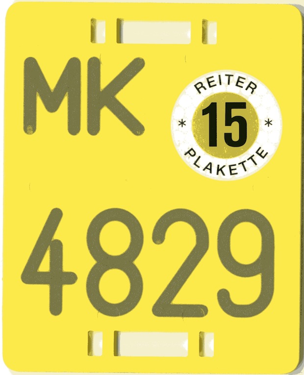 Die Plaketten können ab sofort beim Märkischen Kreis beantragt werden. Jeder, der in der freien Landschaft oder im Wald reitet, muss ein gut sichtbares und beidseitig am Zaumzeug des Pferdes angebrachtes gültiges Reitkennzeichen besitzen. Das betrifft sowohl die Benutzung privater als auch öffentlicher Straßen und Wege. Die zwei gelben Reitkennzeichen beziehen sich immer auf den Reiter. Auf diese Schilder müssen die jährlich zu wechselnden farblichen Reiterplaketten aufgeklebt werden. Ab sofort sind nur noch Reitkennzeichen mit einer „gelb“-Plakette und den Ziffern „15“ gültig.
