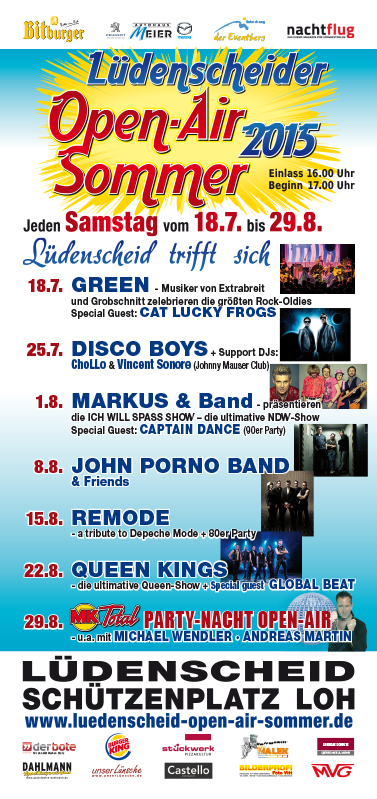 Mit einem musikalischen Doppeldecker startet der Open-Air-Sommer am 18. Juli. Für einen ihrer raren Auftritte hat sich die Hagener Band Green mit Musikern von Extrabreit und Grobschnitt angesagt. Anlässlich ihres 40-jährigen Bühnenjubiläums haben sie Perlen der Rock- und Pop-Geschichte zusammengestellt und performen Songs von Deep Purple bis Pink Floyd, Jethro Tull und Supertramp bis zu The Who, Beatles, Doors und Stones. Als Special Guest sind C.A.T. Lucky Frogs vor Ort, eine von Lüdenscheids beliebtesten Bands, die rein akustisch Klassiker von AC/DC bis Kiss und neuere Songs von Reamonn bis Lady Gaga aufführt.