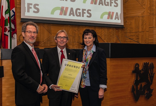 Überreicht wurde Bürgermeister Dr. Peter Paul Ahrens die Urkunde im Rahmen der Mitgliederversammlung gemeinsam von Michael Heinze, Ministerium für Bauen, Wohnen, Stadtentwicklung und Verkehr des Landes Nordrhein-Westfalen (MBWSV) und Christine Fuchs vom Vorstand der AGFS.