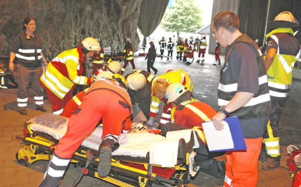 Und das war das angenommene Szenario. Bei einer Großveranstaltung mit rund 2.000 Besuchern wird Pfefferspray versprüht. Eine Massenpanik ist die Folge. Die Menschen rennen orientierungslos aus der Höhle, fallen, brechen sich Beine und Arme, ziehen sich massive Schnittverletzungen zu. Überall liegen Verletzte, schreien um Hilfe. Sie werden von den Rettungskräften vor Ort in drei Kategorien eingeteilt, je nach Schwere ihrer Verletzung. Alle bekommen als Kennzeichnung ein Ticket umgehängt und werden abtransportiert. Das fiktive Krankenhaus war an der Feuerwache in Menden eingerichtet. Der Märkisches Kreis hatte eine Personenauskunftsstelle eingerichtet. Dort konnten eventuell betroffene Angehörige Informationen über ihre Liebsten bekommen.