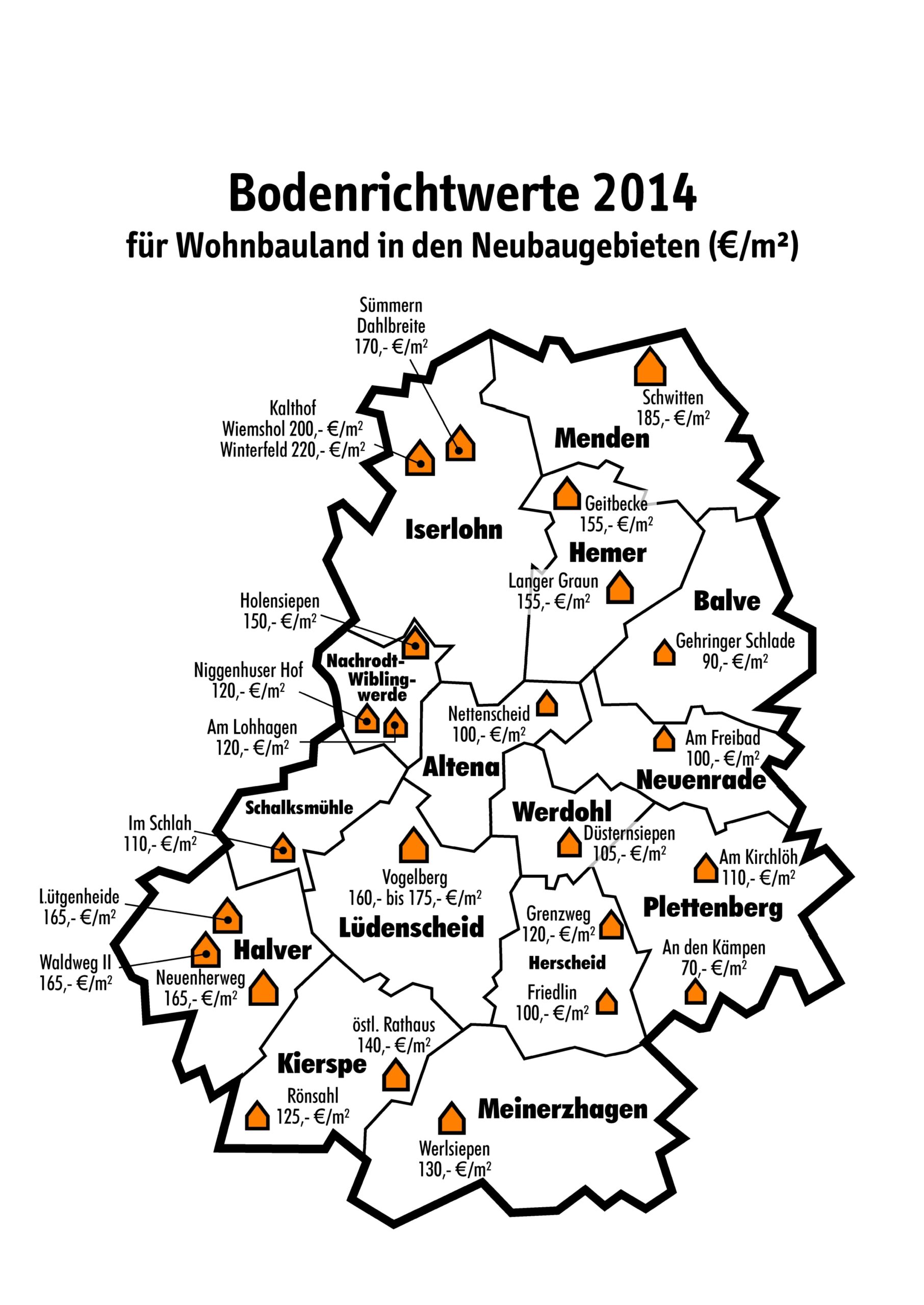 Weitere Fakten und Zahlen, angereichert mit zahlreichen Grafiken und Tabellen, enthält der jetzt durch den Gutachterausschuss veröffentlichte Grundstücks-marktbericht 2014. Dazu erläutert der Geschäftsführer Holger Peters: „Auf über 60 Seiten finden sich Vergleichswerte für Ein- und Zweifamilienhäuser, Erbbau- und Liegenschaftszinssätze, Preisentwicklungen und Indexreihen sowie Durchschnittswerte für land- und forstwirtschaftliche Grundstücke. Ab sofort steht der Grundstücksmarktbericht zum Download im Internet, ergänzend dazu die Bodenrichtwertkarte 2014 mit über 1.400 Bodenrichtwerten. Über eine Zoomfunktion können beliebige Ausschnitte im Kreisgebiet angezeigt werden. Auch ist eine Suche über Adressen möglich, um schnell und aktuell den Bodenrichtwert seines Grundstücks interaktiv abzufragen.“