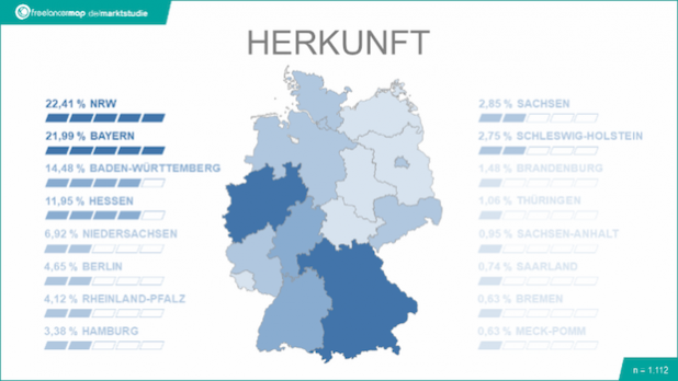 Die meisten Freelancer und damit knapp die Hälfte aller Freiberufler stammt aus Bayern und Nordrhein-Westfalen. Im Gegensatz dazu finden sich alle neuen Bundesländer – bis auf Berlin – am unteren Ende des Tableaus wieder. Schlusslicht des Rankings ist Mecklenburg-Vorpommern, weniger als 0,63 Prozent der Befragten gab an, aus dem Bundesland zu stammen.