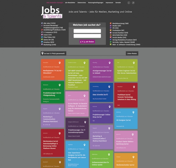 Die Jobkategorien unterscheiden sich dabei farblich und lassen sich so noch einfacher unterscheiden. Außerdem sind die Jobs übersichtlich als Kacheln oder als Liste darstellbar. Wer sich einen Job merken möchte, klickt einfach auf den Pin am Job. Anschließend kann er sich die gemerkten Jobs anzeigen lassen. Und wer immer auf dem Laufenden sein möchte, richtet sich einfach gleich den Job-Newsletter ein.