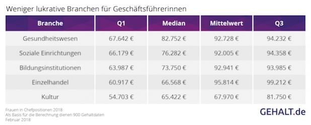 Wo verdienen Frauen in Chefpositionen am meisten? Gehalt.de hat 921 Daten hinsichtlich Unternehmensgrößen und Branchen ausgewertet, um die Gehälter von Geschäftsführerinnen näher zu beleuchten. Ergebnis: Mit einem Jahreseinkommen von circa…