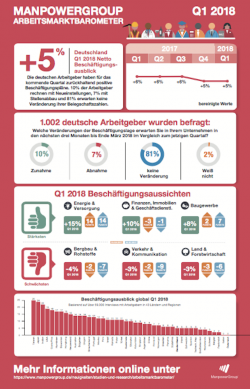 Quelle: Manpower GmbH & Co. KG Personaldienstleistungen/Faktenkontor GmbH Die Einstellungsbereitschaft der deutschen Arbeitgeber für Neueinstellungen bleibt im ersten Quartal 2018 stabil: Der saisonbereinigte Netto-Beschäftigungsausblick erreicht im ersten Quartal 2018 wie…
