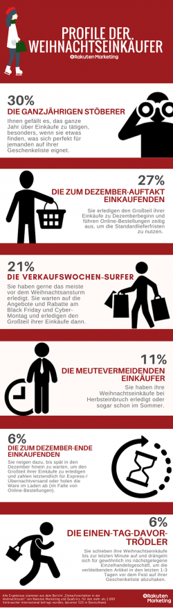 Berlin – Mit dem Black Friday ist die Zeit der Weihnachtsverkäufe ganz offiziell eingeläutet. Und die letzten Wochen vor dem Fest sind bekanntlich die umsatzstärksten: 2016 gaben deutsche Haushalte laut e-Marketer im Schnitt 369 Euro für Geschenke aus. „Zum Fest schenken die Deutschen aber nicht nur großzügig, sie kaufen auch anders als den Rest des Jahres. Marketer müssen sich darauf einstellen”, betont Stefan Bernauer, Director DACH bei Rakuten Marketing. Der Anbieter von dynamischem Retargeting hat gemeinsam mit Qualtrics mehr als 2.000 Online-User weltweit zu ihren Beweggründen und ihrem Kaufverhalten in der Vorweihnachtszeit befragt.