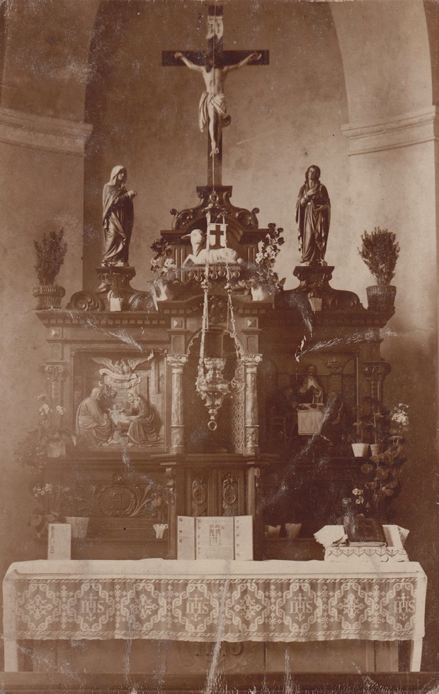 Durch Kollekten trugen die Leitmarer vom 19.04.1915 bis zum 26.09.1915 nochmals 1.500 Mark zusammen. Die restlichen 360 Mark wurden abschließend am 17.01.1916 im Zusammenhang mit den Kosten für die Erstellung des Korpus mit Kreuz und Arbeiten an einer Kommunionbank (Auftrag vom 28.10.1915) beglichen. Der Altaraufsatz aus Holz der Bildhauer Larenz zeigt links und rechts des Tabernakels die Zeichen Alpha und Omega, darüber befinden sich eine geschnitzte Szene der Geburt Jesus Christus im Stall von Bethlehem mit Maria und Josef sowie eine Schnitzerei, die Christus mit den Emmaus-Jüngern abbildet.