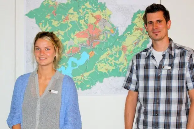 “Für Rückfragen stehen Jennifer Konz, Tel. 02722/64-320, E-Mail j.konz@attendorn.org, Markus Hohmann, Tel. -317, E-Mail m.hohmann@attendorn.org und Martin Plückebaum, Tel. -311, E-Mail m.plueckebaum@attendorn.org zur Verfügung. Diese drei Mitarbeiter der Hansestadt Attendorn stehen darüber hinaus zu den bekannten Öffnungszeiten des Rathauses für Fragen und Anregungen zum Thema „Windkraft in Attendorn“ zur Verfügung. Bildzeile „konz-hohmann.jpg“: Für Rückfragen zum Thema Windenergie in Attendorn stehen im Rathaus unter anderem Jennifer Konz und Markus Hohmann zur Verfügung.
