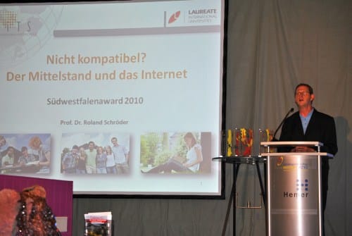 Das Thema Mittelstand und Internet stand im Mittelpunkt der Veranstaltung. Professor Dr. Roland Schröder, BITS, Weiße Q aus Iserlohn referierte über das Thema „Nicht kompatibel? Der Mittelstand und das Internet“. Er erläuterte in seinem Vortrag, wie sich die Unternehmenskommunikation durch das Internet und ganz speziell durch die sozialen Netzwerke verändert hat. Er zeigte im Detail auf, warum die Teilnahme an den Entwicklungen im Internet nicht nur Pflicht ist, sondern auch gelebt werden muss. Nicht alles was „gratis“ ist, ist auch kostenlos. Ein ernster Umgang mit dem Medium Internet ist nicht „mal eben nebenbei“ gemacht, sondern verursacht Kosten – Personalkosten, auch wenn die Dienste an sich (z.B. Facebook) gratis sind. Die Marken- und Produktwahrnehmung verlagert sich aber weiter von alten Medien ins Internet. Und deshalb sollte sich der Mittelstand gerade deshalb ernsthaft mit dem Medium beschäftigen.