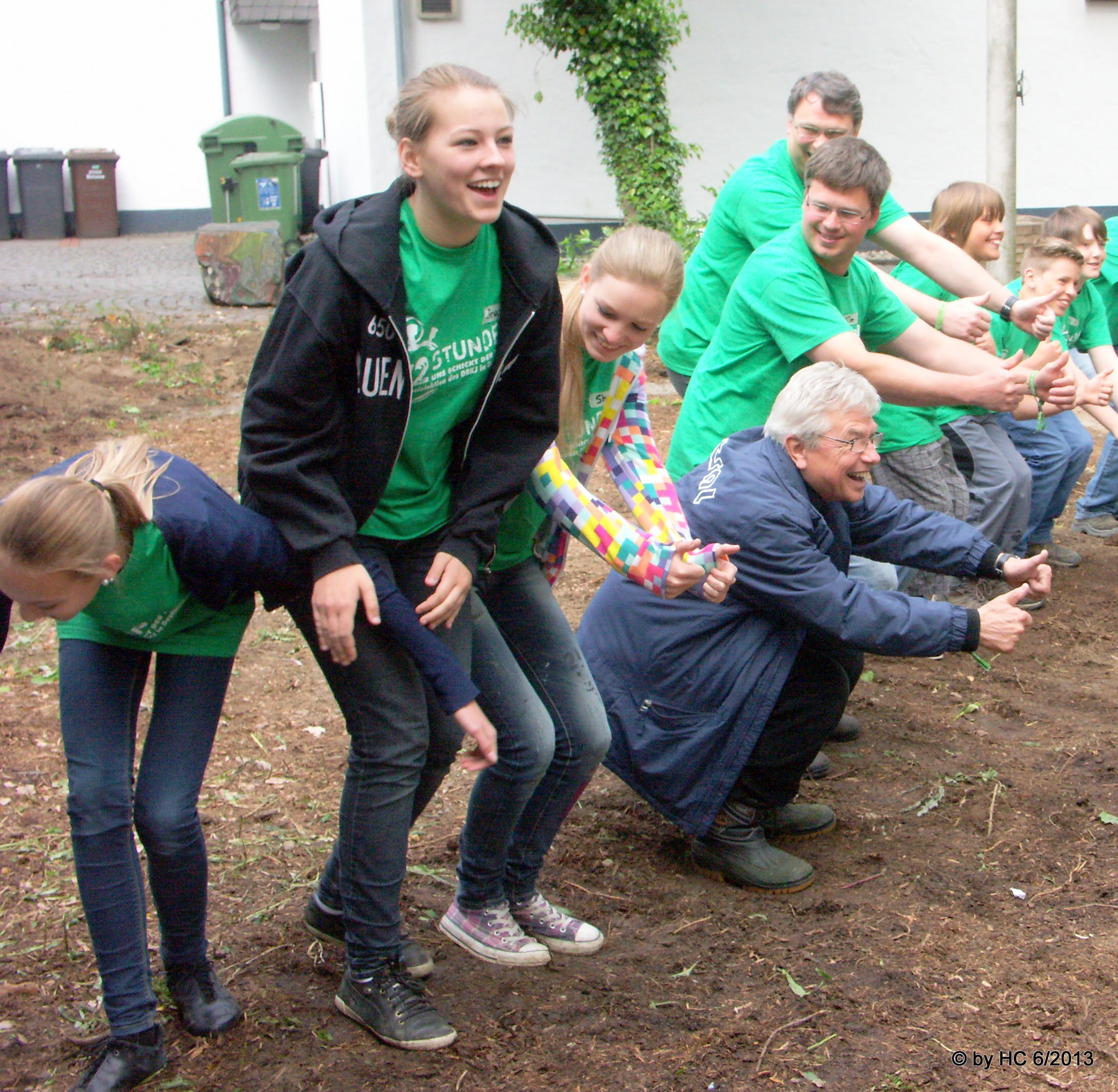 Nach der Bekanntgabe des Einsatzplanes schwor sich die lustige Gemeinschaft durch allerlei ulkiger Sprüche und Morgengymnastik ähnlichen Bewegungen auf den arbeitsreichen Tag ein. Mitten in diesem Haufen energiegeladener Jungen und Mädels ist der erste Mann der Stadt Neuenrade- Bürgermeister Klaus Peter Sasse- gar nicht sonderlich aufgefallen. Frei nach dem Motto. „Im Herzen jung“ hatte er sich in diesen Trupp eingereiht um dem Einsatzplan zu lauschen. Selbst bei den akrobatischen anmutenden Einschwörungs- Übungen stand er den jungen Leuten in nichts nach.