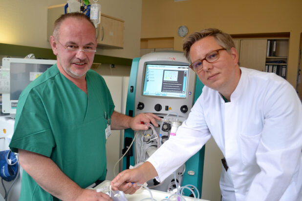 Patienten auf Intensivstationen sind in einem kritischen Zustand und oft von organunterstützenden Behandlungen abhängig. Dazu zählen künstliche Beatmung oder eine kontinuierliche Nierenersatztherapie. Im St. Martinus-Hospital, Olpe ist das sog. Prismaflex als weltweit meist genutztes System für alle kontinuierlichen Nierenersatztherapien sowie für Leberunterstützungsverfahren im Einsatz. Dieses System wurde nun erweitert und eröffnet damit neue und für den Patienten schonendere Therapieoptionen zur Kohlendioxid-Entfernung. Dr. Cai Schelo, Facharzt für Nephrologie und leitender Oberarzt der Klinikdialyse am St. Martinus-Hospital erklärt, was es damit auf sich hat: „Zum Atmen benötigt der Mensch vereinfacht gesagt vor allen Dingen Sauerstoff und die Möglichkeit Kohlendioxid (CO2) auszuatmen. Zweiteres ist bei schwerstkranken Patienten mit Lungenversagen ein schwerwiegendes Problem. Sauerstoff könnte zwar durch eine künstliche Beatmung zugeführt werden, aber die Lunge kann beim Versagen nicht mehr die Funktion zur Freisetzung des CO2s übernehmen. Das ist lebensbedrohlich, in der Behandlung komplex und führte in der Vergangenheit zur Verlegung in eine maximalversorgende Klinik, wie z. B. eine Uniklinik.“