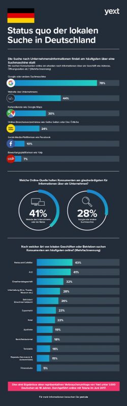 Berlin – Ist das Hotel hundefreundlich, bietet das Restaurant vegane Speisen, wo finde ich die nächste Filiale des Schuhgeschäfts XY? Immer mehr Konsumenten suchen im Internet nach Informationen über lokale Geschäfte und Unternehmen. 78 Prozent der Deutschen geben an, solche Unternehmensinformationen am ehesten über Google oder andere Suchmaschinen zu suchen. 44 Prozent gehen direkt auf die Website des Unternehmens, um diese Details zu finden. Das sind Ergebnisse einer repräsentativen Umfrage unter 1.000 Deutschen, die Yext, weltweiter Technologieanbieter für das Management öffentlicher Unternehmensdaten, im Juni 2017 durchgeführt hat.