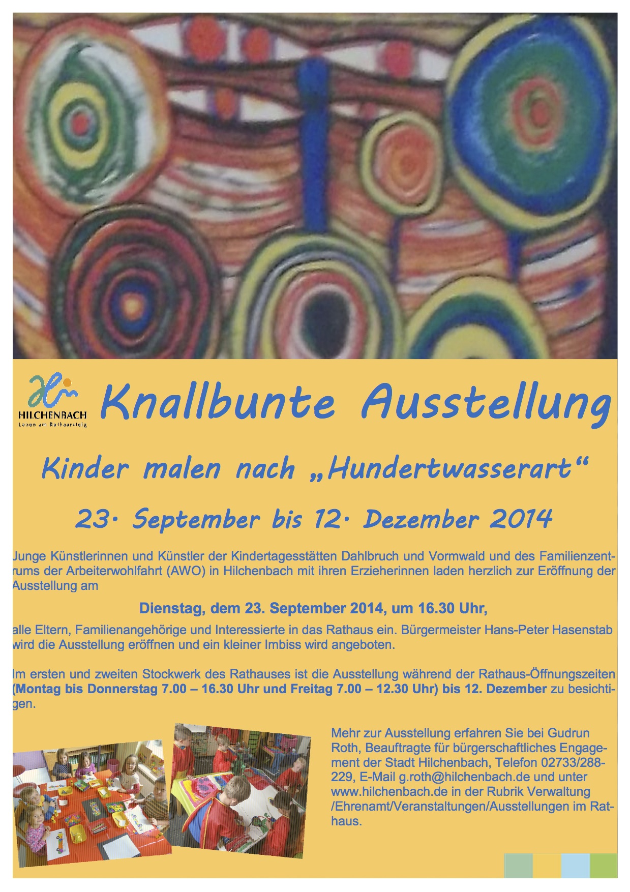 Über Zugänge, wie zum Beispiel vom Schneckenhaus zur Spirale oder Hundertwasser als „Zauberer“ der Farben, haben die Kinder sich mit eigenen Kunstwerken in verschiedensten Mal- und Basteltechniken mit dem Lebenswerk des Malers, Architekten, Ökologen und Vordenkers Friedensreich Hundertwasser auseinandergesetzt. Selbst das Wahrzeichen der Stadt Hilchenbach, die Ginsburg, wurde nach „Hundertwasserart“ umgestaltet. Diese bunte Vielfalt in Form und Farbe wird bis 12. Dezember im Rathaus zu sehen sein.