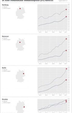 Lübeck – Während die Preissteigerung in Hannover und Hamburg im Vergleich zu den Vorquartalen leicht zurückgeht, nehmen die Berliner Immobilienpreise noch einmal an Fahrt auf. Im zweiten Quartal 2017 zahlen…