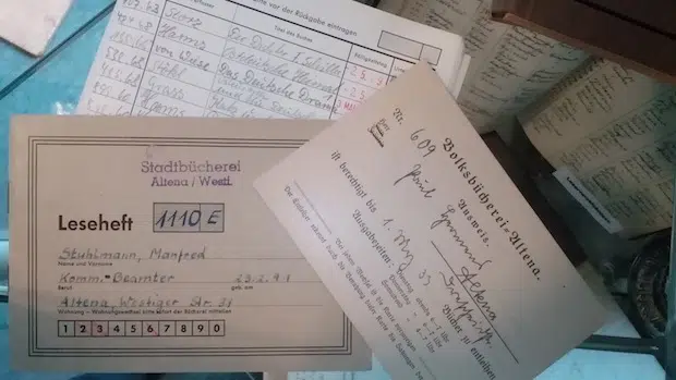 Altena - Zur morgigen Eröffnung der Ausstellung "150 Jahre Stadtbücherei Altena" um 19 Uhr mit Sektempfang im Lesecafé ist eine Vitrine mit historischen Materialien aus der Geschichte der Stadtbücherei ausgestellt.…