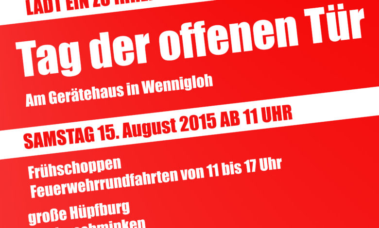 Wennigloh - Am Samstag, den 15.08.2015 veranstaltet die Löschgruppe Wennigloh der Arnsberger Feuerwehr ab 11:00 Uhr wieder ihren Tag der offenen Tür, zu dem sie alle Interessierten sehr herzlich einlädt.