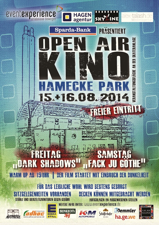 Hagen – Die Hagener Veranstaltergemeinschaft (Skyline Kino, Event Experience, Alex Talash und die HAGENagentur) organisieren zum zweiten Mal ein Freiluft Kino-Erlebnis bei freiem Eintritt. Nach der erfolgreichen Premiere im letzten Jahr am Bismarckturm, findet das Open-Air-Kino in diesem Jahr an zwei Tagen am Fr. 15.08 und Sa. 16.08 im Hamecke-Park auf der Veranstaltungsfläche gegenüber der neuen Skateranlage statt.