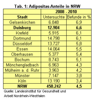 Aktuelle Untersuchungen haben ergeben, dass in Nordrhein-Westfalen 52,8 Prozent der Erwachsenen an Übergewicht leiden. Das ist im Vergleich zu 2005 ein Zuwachs von 3,4 Prozent. Somit liegt der durchschnittliche Body-Mass-Index am Rhein-Ruhr-Gebiet bei 25,9. Ab einem Wert von 25 gilt man als übergewichtig.