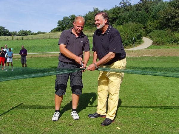 Head-Greenkeeper Stefan Menke (links) eröffnet gemeinsam mit dem Präsidenten des Golfclubs Repetal, Dr. Alfon Naber das neue Trainingsgelände