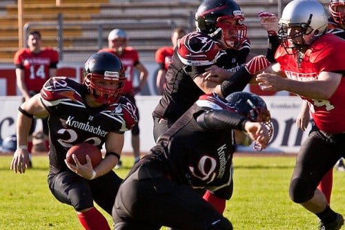 Nach der letzten Heimspielniederlage hatte das Footballteam der Siegen Sentinels bei den Fans etwas gut zu machen. Mit dem 42: 7 über die Solingen Paladins II ist diese Wiedergutmachung vor knapp 200 Zuschauern zweifelsohne gelungen! Von Beginn an waren die ‚Wächter des Krönchens‘ in Spiellaune. In der ersten Angriffssequenz wurde ein großer Raumgewinn durch das Laufspiel noch durch eine Strafe annulliert, aber direkt im nächsten Spielzug erzielte die Offense durch Receiver Maximilian Sänger per Passspiel die ersten Punkte. Und so setzte sich die komplette erste Hälfte des Spiels fort. Die Abwehr gab den Gästen aus Solingen keinerlei Möglichkeit zur Entfaltung; dem frisch verheirateten Defensive End Silvan Taschan und auch Linebacker Klaus Afflerbach gelang es immer wieder, die gegnerischen Ballträger mit Raumverlust zu Boden zu bringen. Dafür brachte der Siegener Angriff mithilfe ihrer bärenstark blockenden Offensive Line den Ball noch dreimal in die Endzone. Unter anderem schufen Offensive Tackle Kristian Mehner und Guard Orazio Bruno immer wieder große Lücken für das eigene Laufspiel und so produzierte Running Back Christian Stein zweimal Punkte auf die Anzeigetafel, Einmal gelang dies dem wieder-genesenen Ballträger Nikita Schmunk. Kurz vor der Pause erzielten die Gäste durch eine Unaufmerksamkeit allerdings doch noch der Anschluss zum 7:27 Halbzeitstand. Diese bemühten sich in der zweiten Hälfte redlich, den Punkteabstand zu verkürzen und erkämpften auch Meter für Meter – zählbares brachten allerdings nur noch die heimischen Sentinels mit Touchdowns durch Receiver Florian Theile und erneut Christian Stein zustande. Eine beeindruckende Leistung stand mit dem Endergebnis von 42: 7 für die Sentinels zu Buche! In zwei Wochen wird sich beim Tabellenführer aus Rheine dann zeigen, wie gut unsere Footballer aus dem Siegerland wirklich sind. Zuzutrauen ist ihnen in dieser Verfassung aber alles!