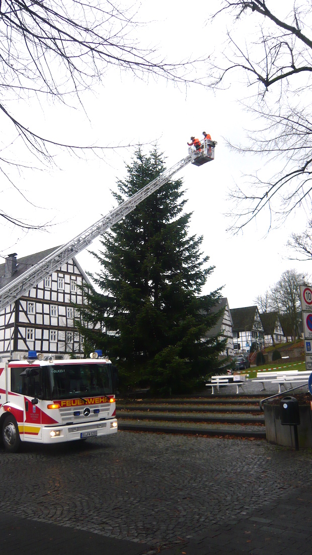Hilchenbach – Nachdem die Feuerwehr Dahlbruch im Januar diesen Jahres die beiden hohen Weihnachtsbäume der letzten Saison am Markt in Hilchenbach – etwa zehn Meter hoch, versehen mit 300 Metern Lichterkette mit 2280 LED – und Am Kampen in Dahlbruch – etwa sieben Meter hoch, versehen mit 200 Metern Lichterkette mit 1520 LED – mittels ihrer neuen Drehleiter in Eigenregie sorgsam von den Lichterketten befreit hat, hilft die Feuerwehr nun auch beim Schmücken der beiden Bäume für die kommende Weihnachtszeit.